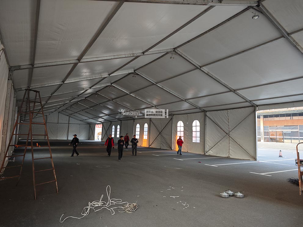 鄭州篷房租賃搭建展銷會貿易交流篷房現場。河南長垣即將舉行的一場頂墻裝飾材料博覽會上,華熠公司卻在開始之前就來到了這里開始施工,這是因為現在的短時間展會交易會通常會選擇搭建篷房來使用,篷房搭建高效靈活,相比去尋找一處建筑空間,價格還是更合適的。