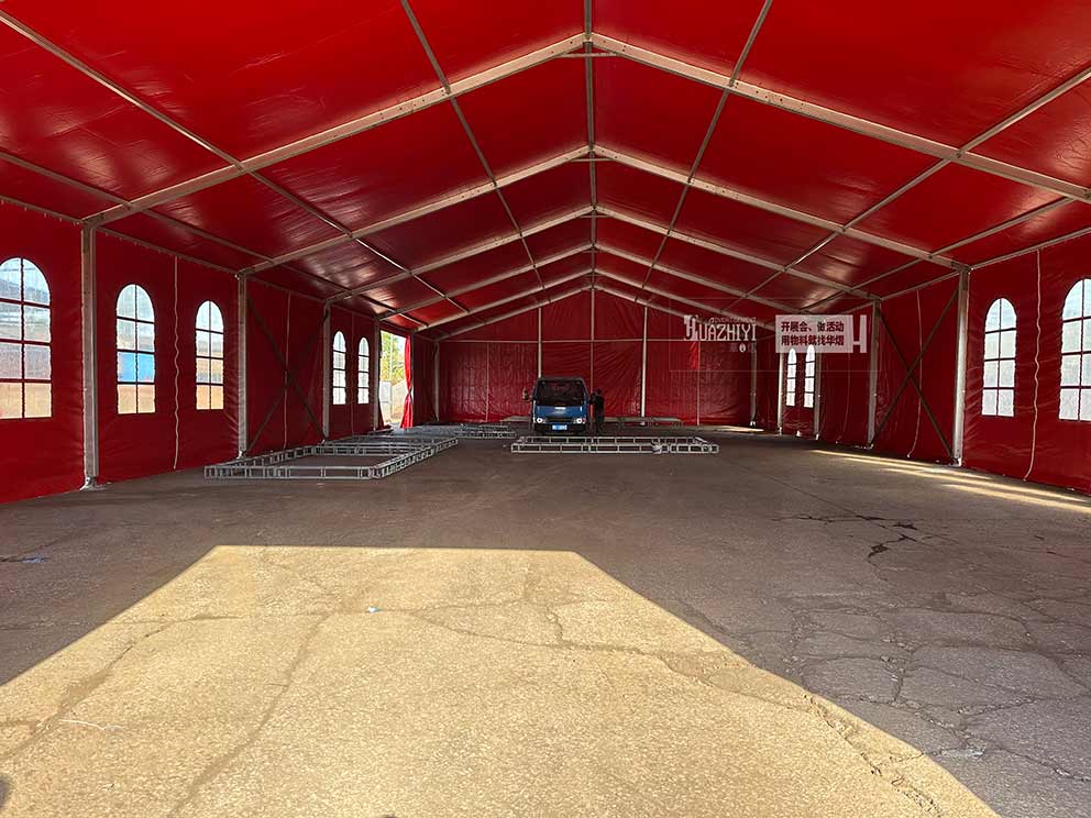 鄭州婚慶篷房出租公司搭建紅色喜篷現(xiàn)場。總之,鄭州婚慶篷房出租公司以其專業(yè)的技術(shù)實力、獨特的設(shè)計理念和周到的服務(wù),贏得了廣大新人的認(rèn)可和信賴。在未來的日子里,我們將繼續(xù)為更多的新人打造出一個又一個夢幻般的婚禮現(xiàn)場。
