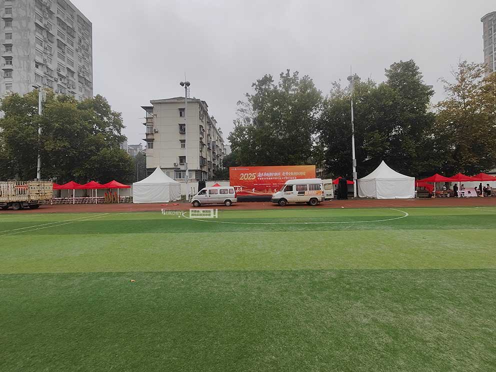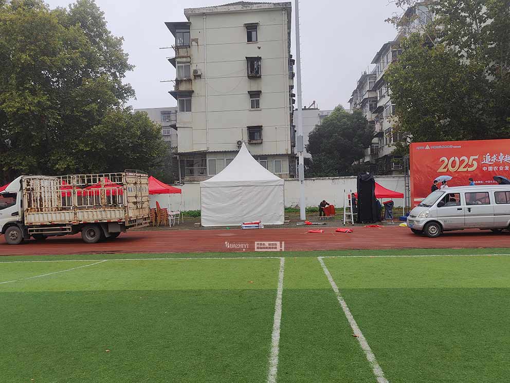 平頂山篷房租賃精準把握中國農業發展銀行湖北分行職工運動會的活動特性,以尖頂篷房、折疊帳篷、桁架、折疊椅、道旗等物料,通過科學布局為運動會打造出“功能清晰、氛圍熱烈、服務周全”的場地空間,助力活動有序開展。 平頂山篷房租賃巧妙運用色彩與造型的搭配,讓篷房成為運動會現場的視覺亮點。白色尖頂篷房選用高密度PVC篷布,單頂直徑5米、高度4.5米,造型輕盈雅致,主要分布在場地核心區域。紅色折疊帳篷則采用醒目亮眼的紅色牛津布頂篷,3米×3米的規格靈活便捷。 桁架、折疊椅、道旗等物料的協同配合,為運動會提供了全方位的功能支撐。桁架搭建在運動會場地中心,表面覆蓋印有“中國農業發展銀行湖北分行職工運動會”字樣的噴繪布。折疊椅輕便實用,布置在白色尖頂篷房內的休息區與賽事觀禮區。道旗則沿運動場周邊道路兩側整齊排列,印有農發行logo,3.5米的高度在風中舒展,形成引導人流、烘托氛圍的“動態風景線”。 平頂山篷房租賃為中國農業發展銀行湖北分行職工運動會打造了一套全方位的布場方案。這套方案既滿足了運動會對功能分區、氛圍營造的需求,又充分考慮了職工的參與體驗,讓運動會在熱烈有序的氛圍中展現團隊凝聚力。